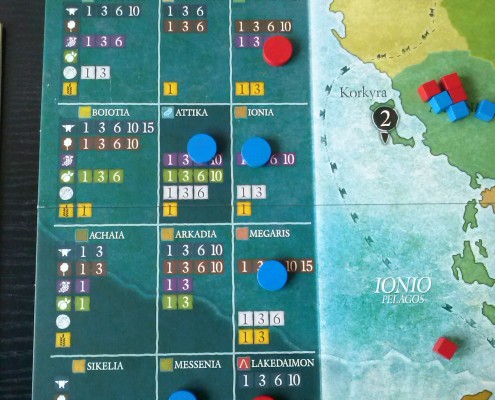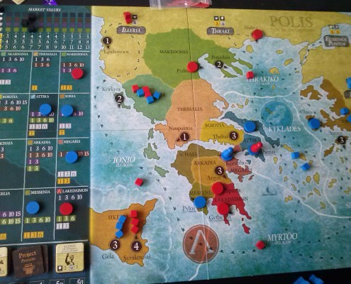 I gdybym miał określić Polis jako mieszankę innych gier: plansza i drewno z Peryklesa, prosta elegancja bitwy rodem z Gry o Tron, podboje pachnące troszkę Twighlight Struggle, ekonomia gdzieś pomiędzy Through the Ages, Puerto Rico i Wysokim Napięciem. Zresztą odnosząc się do Through the Ages, to mam wrażenie, że gra może spodobać się jej fanom, którym brakuje jednak planszy i walki o wpływy na jej „fizycznych” regionach. Nie wspominam o rozwoju naukowym, bo w grze go nie ma, jest jednak możliwość „budowy” pewnych projektów, które pomagają zbliżyć się do zwycięstwa. Rezerwuję sobie tu prawo, zapewniania, że to tylko ogólne wrażenia, bo Polis nie zrzyna wprost.